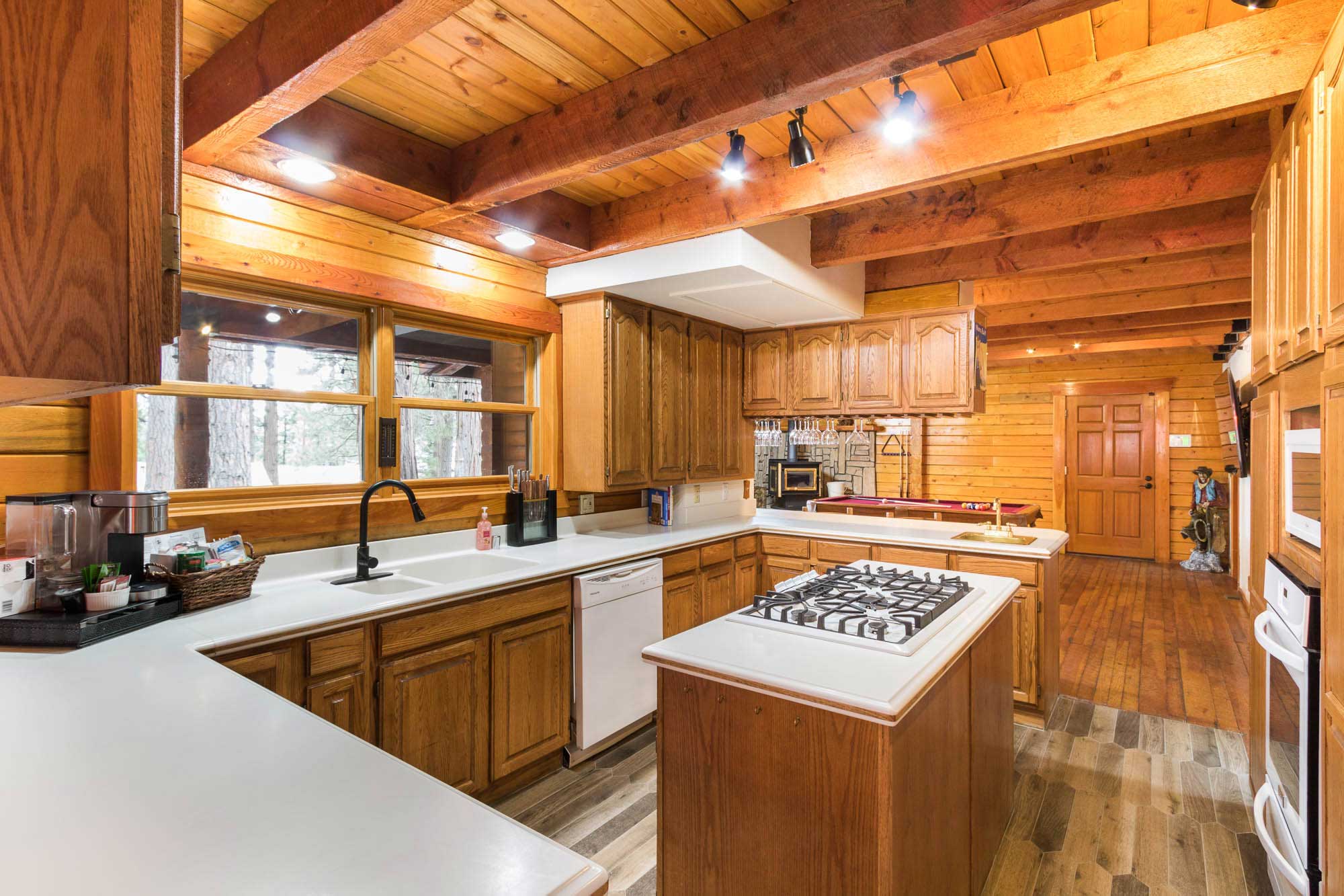 When you walk in, you will immediately notice the stunning wood-burning fireplace, cathedral wood ceilings and gorgeous rustic hardwood floors. Inside, cozy up by one of the wood burning fireplaces or open the doors and let the mountain breeze in. Outside, relax around one of two fire pits or get to grillin on the BBQ with a glass of wine. This magnificent 2-story luxury cabin features 3 bedrooms upstairs and a children’s play area with HDTV and streaming gaming service and various board games and puzzles. When game time turns to sleep time, full-size futon sofa opens up to sleep 2 guests. Downstairs, the main floor includes a great room, kitchen, John Wayne Jr. Suite and Hoss’ Billiards room.